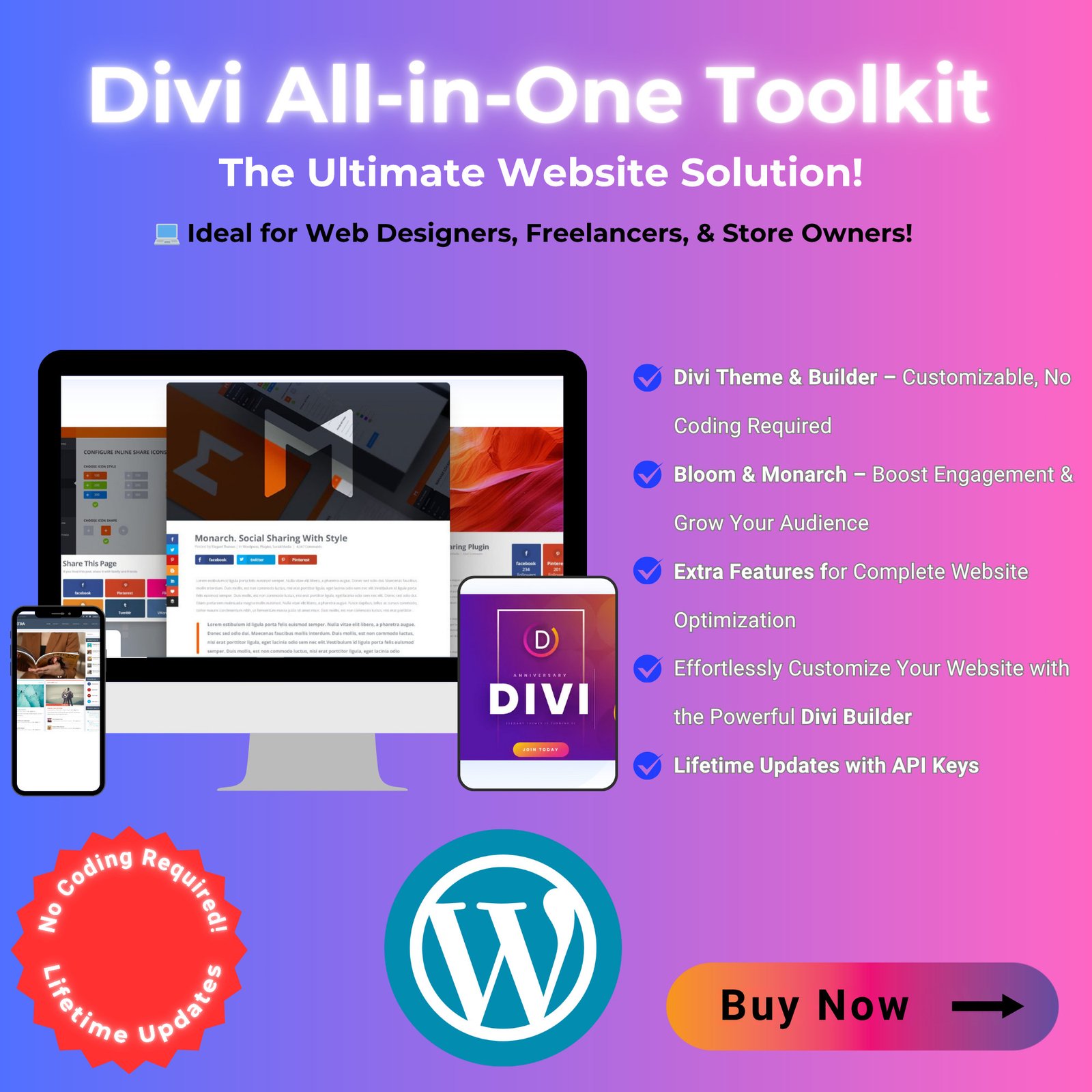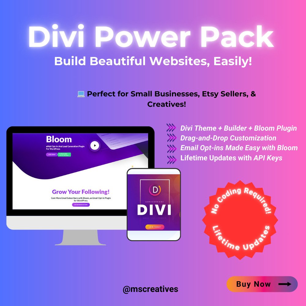 🌟 Create a stunning, fully-functional website with Divi All-in-One Pro. This comprehensive package includes Divi Theme, Divi Builder, Bloom, Monarch, and Extra—everything you need to design, optimize, and grow your website with ease. Whether you’re an Etsy seller or a creative entrepreneur, this toolkit gives you the tools you need to succeed.
