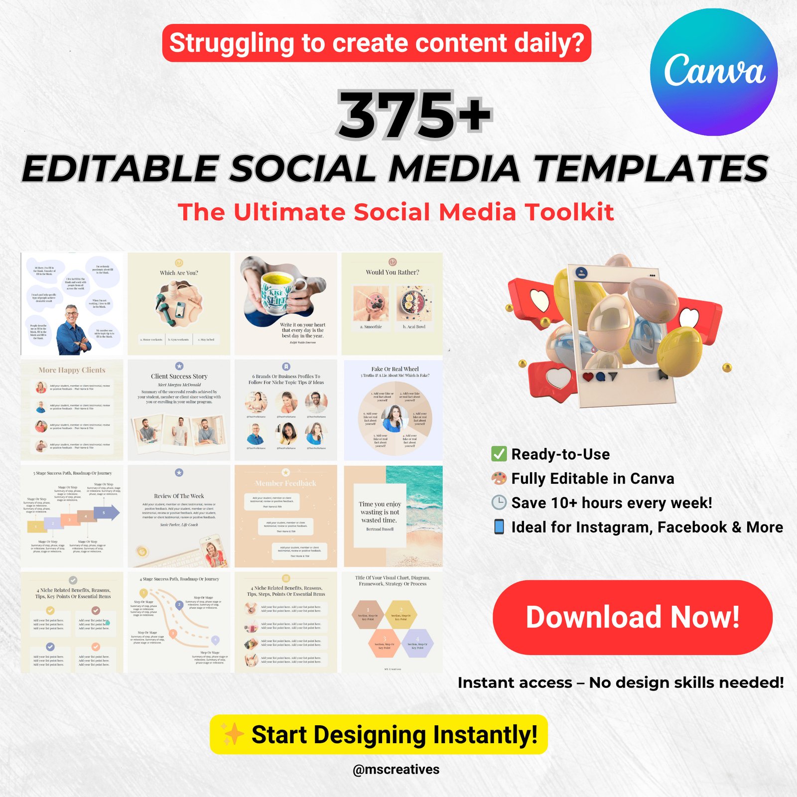 ✨ Transform your social media strategy with the Ultimate Social Media Toolkit! Featuring 375+ Canva templates, this all-in-one pack is your go-to solution for creating engaging, professional posts across all your platforms.